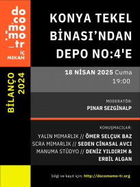 Bilanço 2024'ün İç Mekan Komitesi tarafından düzenlenecek olan ikinci etkinliği "Konya Tekel Binası'ndan Depo No:4'e" başlığıyla 18 Nisan 2025 Cuma günü gerçekleşecek.