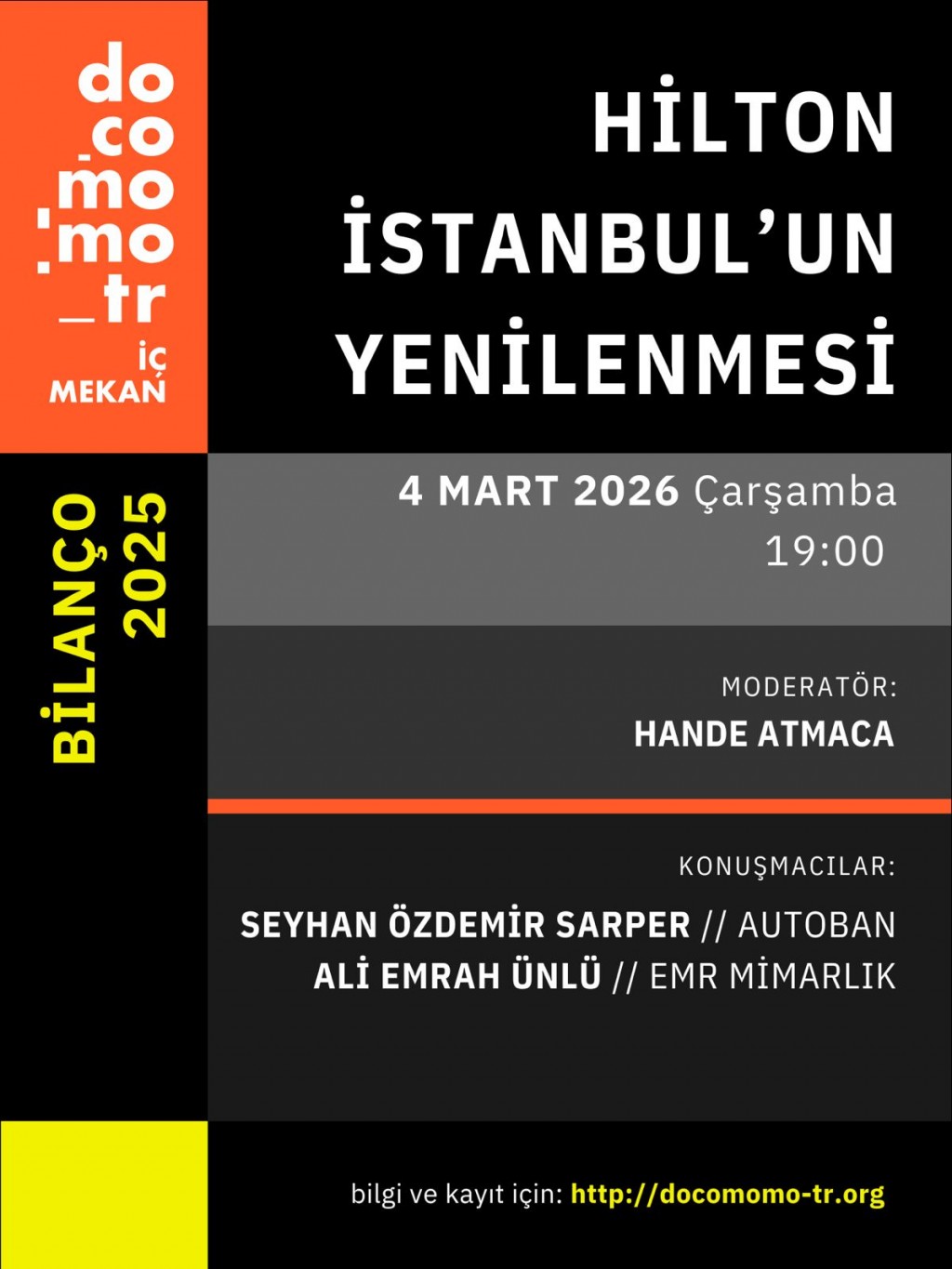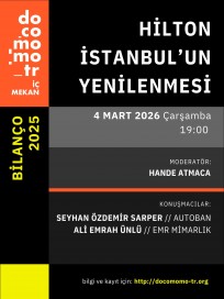 Bilanço 2025 kapsamında düzenlenen üçüncü etkinlik, docomomo_tr İç Mekan Komitesi tarafından 4 Mart 2026 Çarşamba günü saat 19.00’da gerçekleştirilecektir. “Hilton İstanbul'un Yenilenmesi” başlıklı oturumun moderatörlüğünü Hande Atmaca üstlenecek, Seyhan Özdemir Sarper ve Ali Emrah Ünlü konuşmacı olarak yer alacaktır.