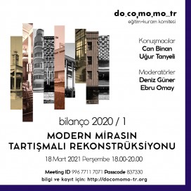 Modern mimarlık mirasına ilişkin çeşitli sorunların temellendiği durumların sorgulanacağı bilanço 2020'nin eğitim + kuram komitesinin düzenlediği ilk etkinliği 18 Mart 2021 tarihinde gerçekleştirilecektir.