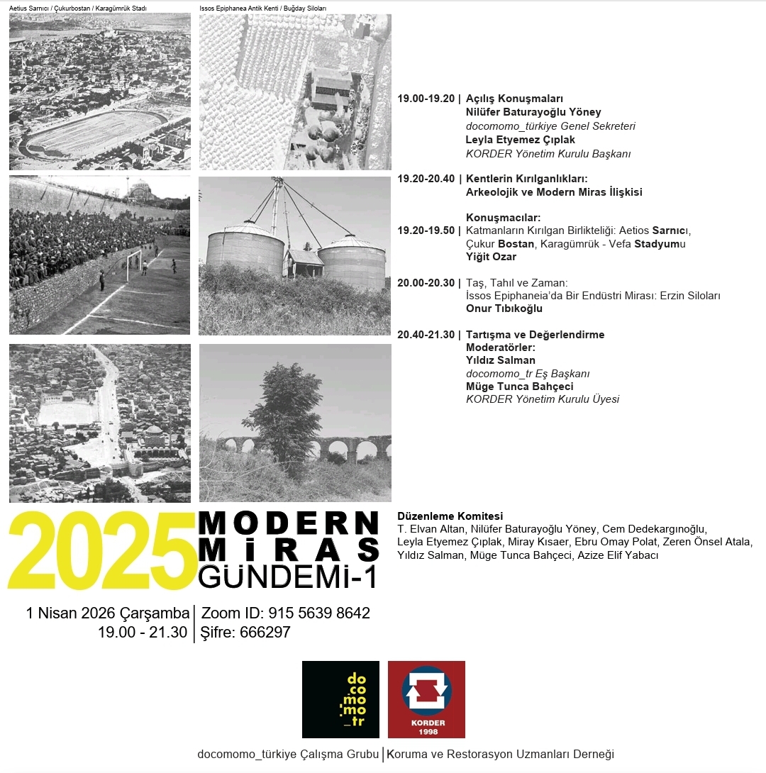 1 Nisan 2026 tarihinde düzenlenecek TÜRKİYE’NİN MODERN MİRAS GÜNDEMİ 1 - 2025 başlıklı toplantıda, 2025 yılı içerisinde Türkiye’de modern mimarlık mirasının korunması alanında gündeme gelen konular tartışılacaktır.
