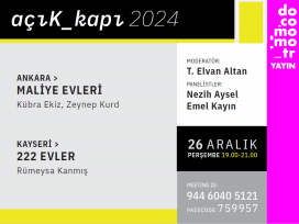 Normal koşullarda halka açık olmayan, girilemeyen ya da kolay erişilemeyen yapıların video sunuşlarla tanıtılmasını hedefleyen Açık Kapı etkinliği, 26 Aralık 2024 Perşembe günü 19.00-21.00 saatleri arasında çevrimiçi olarak gerçekleşecektir. Ankara'dan Maliye Evleri ve Kayseri'den 222 Evler'in sunulacağı etkinlik, video sunumları ve ardından sunulan yapılar üzerine değerlendirmelerin yapılacağı panelden oluşacaktır.